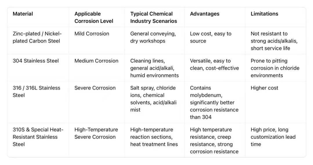 The corrosion intensity varies greatly in chemical scenarios. Determining the environment first, and then narrowing down the material and specifications, is the first step to efficient chain selection.